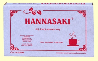 Názov HANNASAKI (v japončine "jarný kvet"), predstavuje vlastnosti ako život plný novej energie, sviežosti, zdravia, čistoty a krásy, čo všetko sú schopnosti účinkov tohto kráľovského čaju. Tí z vás, ktorí patríte medzi milovníkov populárneho zeleného čaju SAYONARA, budete mať porovnanie, pri ktorom zistíte, že celá rada uvedených vlastností je veľmi podobná alebo priamo zhodná s popisovaným kráľovským čajom HANNASAKI. Niektoré účinky sú však mierne odlišné, čo je dané odrodou a zložením čaju. Meraním na zatiaľ najdokonalejšom diagnostickom prístroji Prognos, ktorý bol vyvinutý pre potreby diagnostiky v kozmickom programe, bolo zistené, že oba čaje sa navzájom ideálne doplňujú. V súčasnej dobe je už dodávaný čaj HANNASAKI v novom prevedení - v prášku, čo spôsobuje kvalitnejšie a dokonalejšie vyluhovanie. Nová zmes obsahuje najviac i vysoko kvalitný zelený čaj, ktorý doplňuje pôvodný harmonizačný účinok doplňovaním prípadného deficitu bioenergie, a to je významná kvalitatívna zmena. Tiež sa zjednodušila príprava. Asi tretinu zarovnanej lyžičky zalejeme 3 dcl horúcej vody, zamiešame, necháme ustáť a pijeme ihneď, ako náhle je teplota vyhovujúca (zo 100 gramov čaju zhotovíme 500 hrnčekov nápoja!). Po vypití môžeme zaliať ešte raz. Čaj nesladíme, pretože by sme zničili jeho zásaditosť, čo je jedna z jeho najdôležitejších vlastností. Nie je tiež vhodné používať kovovú lyžičku, preto je priložená lyžička plastová. Pitie tohto čaju by malo nahradiť celodenný pitný režim. Väčšie dávky silnejšieho čaju sú vhodné pre začiatok chudnutia, prvým príznakom je častejšie vyprázdňovanie, čo je spôsobené silnejšou peristatikou čriev. Tento jav vítajme, lebo spôsobí rýchlejšie odstraňovanie toxických látok, ktoré sa inak ukladajú práva v tukových zásobách. Dosiahneme tak dvojitého efektu - prečistenie organizmu a odbúranie tukových vrstiev.